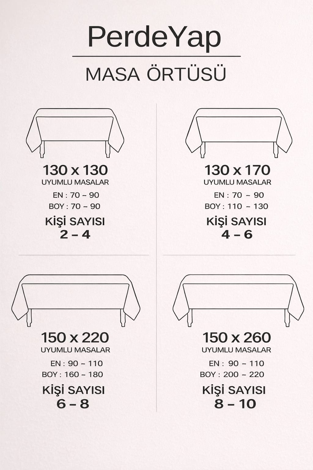 Ürünümüzün 4 Farklı ölçü varyantı bulunmaktadır. Masanızı ölçüp ona göre sipariş veriniz lütfen.